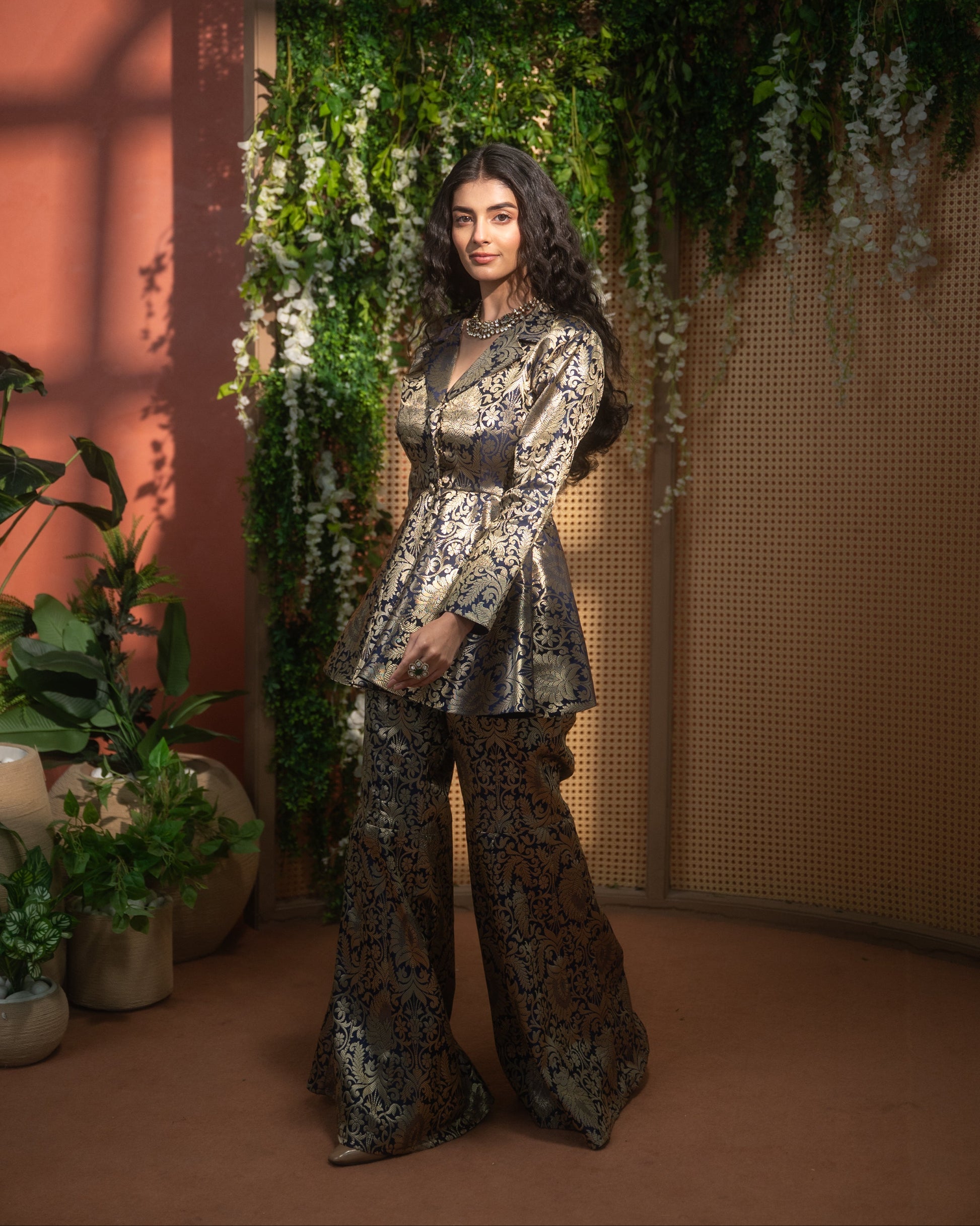 Brocade Indo-Western peplum top with flared pants